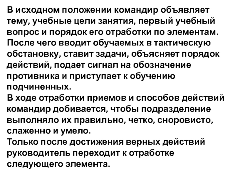 В ходе отработки приемов и способов действий командир добивается, чтобы подразделение выполняло их правильно, четко, сноровисто, слаженно и умело.