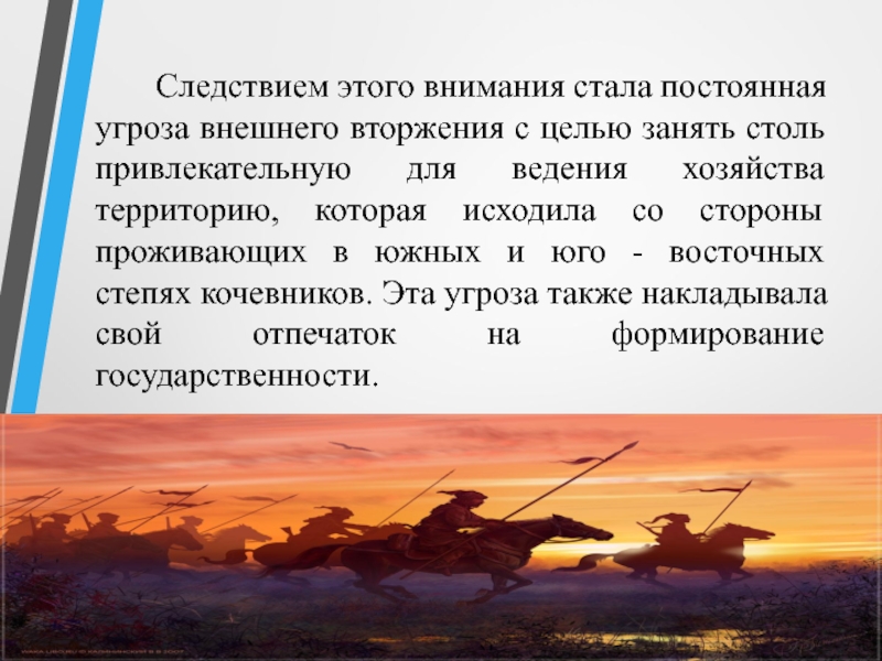 привлекательную для ведения хозяйства территорию, которая исходила со стороны проживающих в южных и юго - восточных степях кочевников. Эта угроза также накладывала свой отпечаток на формирование государственности.