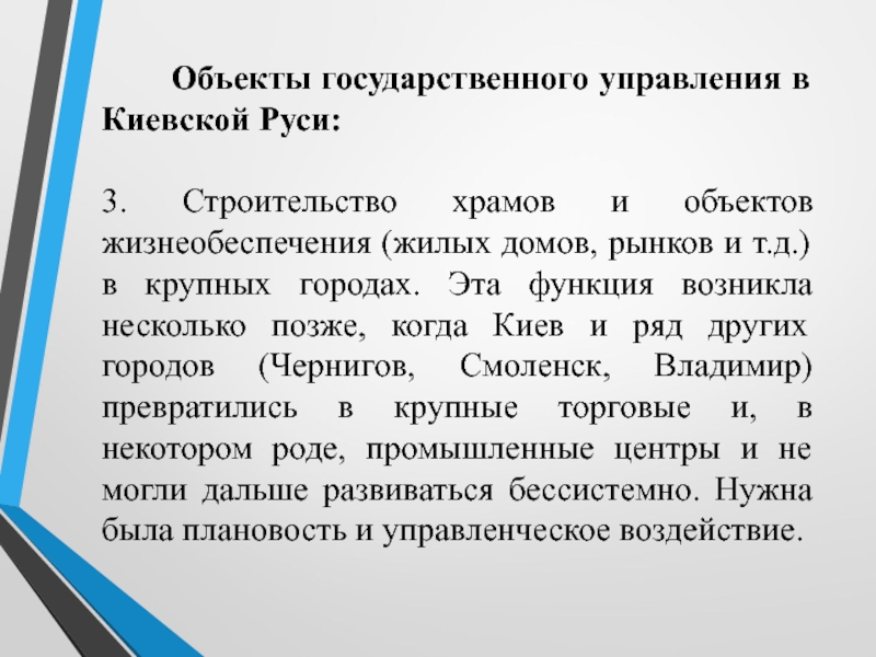 в крупных городах. Эта функция возникла несколько позже, когда Киев и ряд других городов (Чернигов, Смоленск, Владимир) превратились в крупные торговые и, в некотором роде, промышленные центры и не могли дальше развиваться бессистемно. Нужна была плановость и управленческое воздействие.