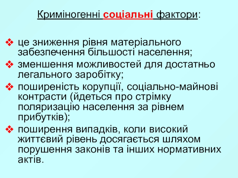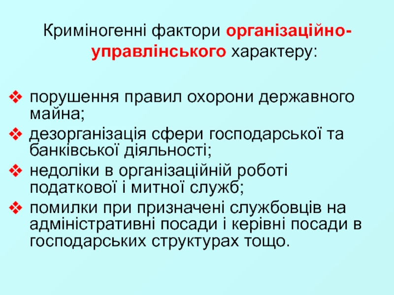 Слайд 19Криміногенні фактори організаційно-управлінського характеру: