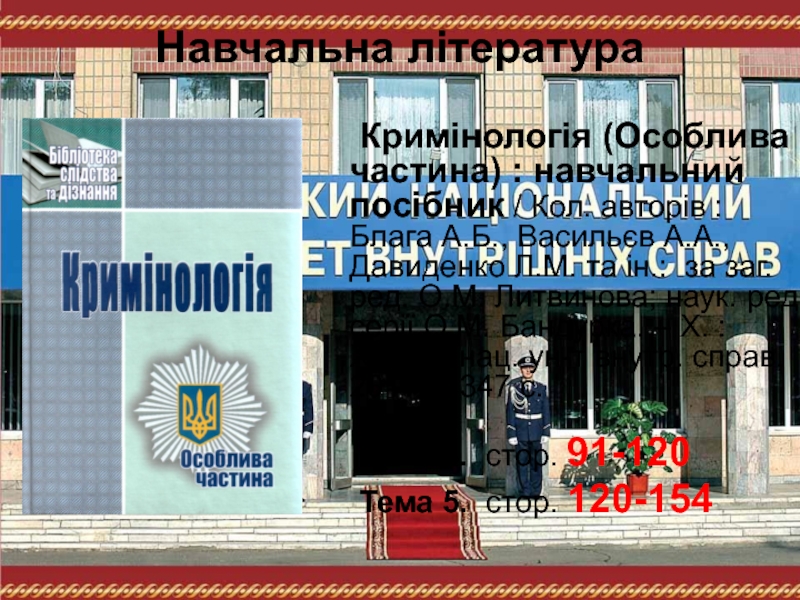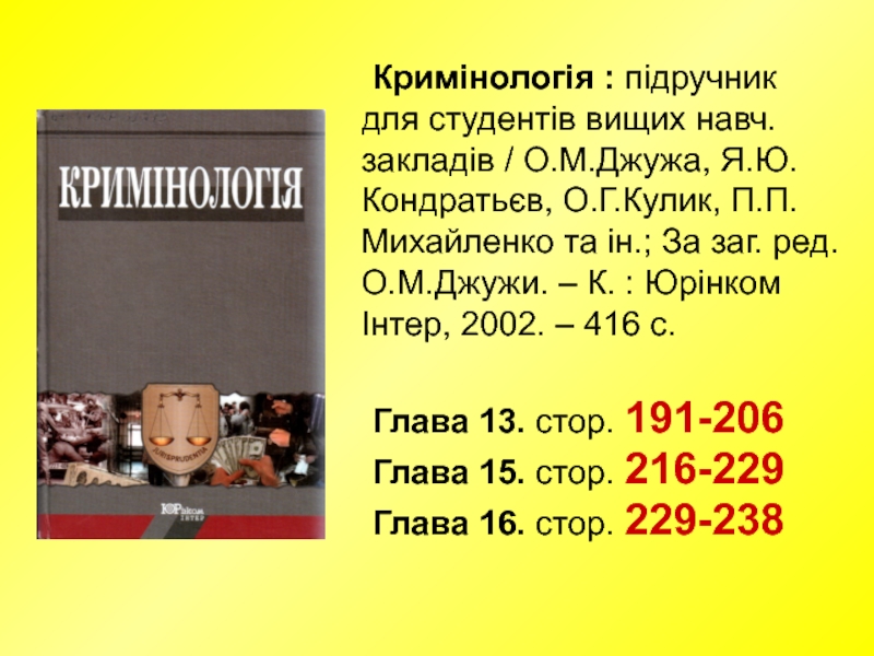 Слайд 4 Кримінологія : підручник для студентів вищих навч. закладів / О.М.Джужа,