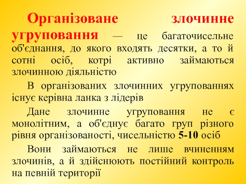 Слайд 28 Організоване злочинне угруповання — це багаточисельне об'єднання, до якого входять