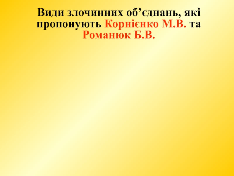 Слайд 25Види злочинних об’єднань, які пропонують Корнієнко М.В. та Романюк Б.В.