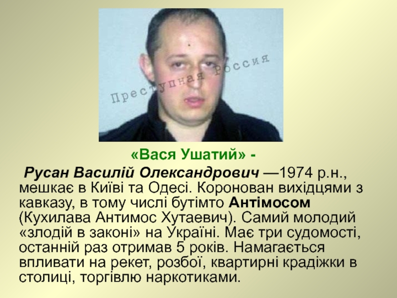бутімто Антімосом (Кухилава Антимос Хутаевич). Самий молодий «злодій в законі» на Україні. Має три судомості, останній раз отримав 5 років. Намагається впливати на рекет, розбої, квартирні крадіжки в столиці, торгівлю наркотиками.