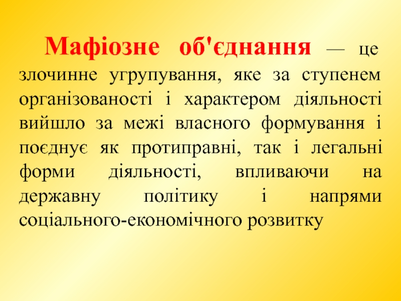 Слайд 29 Мафіозне об'єднання — це злочинне угрупування, яке за ступенем організованості