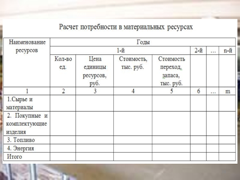 3. План потребности фирмы в материальных ресурсах. В этом разделе необходимо обосновать потребности в факторах производства, представить расчеты издержек на требуемые материальные факторы: сырье и основные материалы, компоненты и полуфабрикаты, топливо и энергию на технологические цели, производственное снабжение. При этом необходимо рассмотреть такие моменты, как наименование ресурса, единицы измерения, цена за единицу измерения, расход, стоимость ресурса.