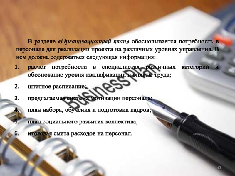 Слайд 13В разделе «Организационный план» обосновывается потребность в персонале для реализации
