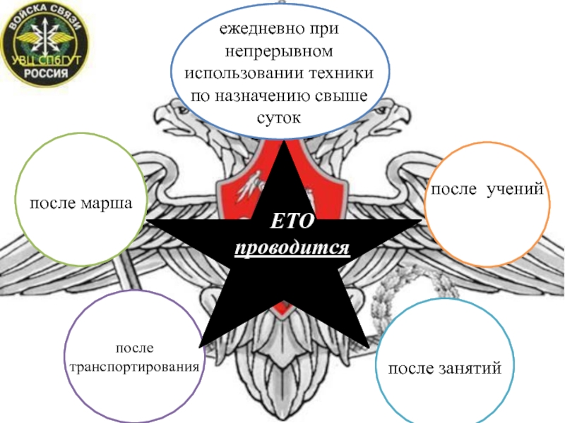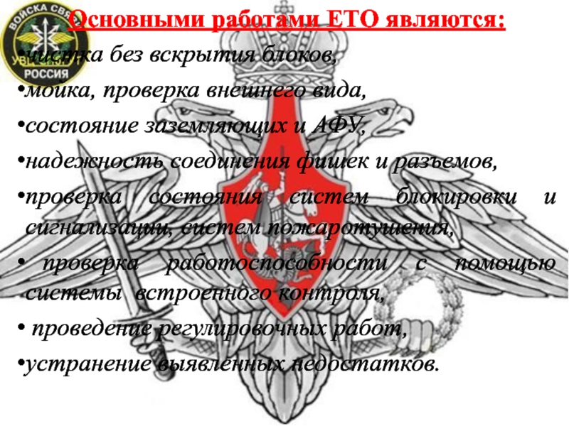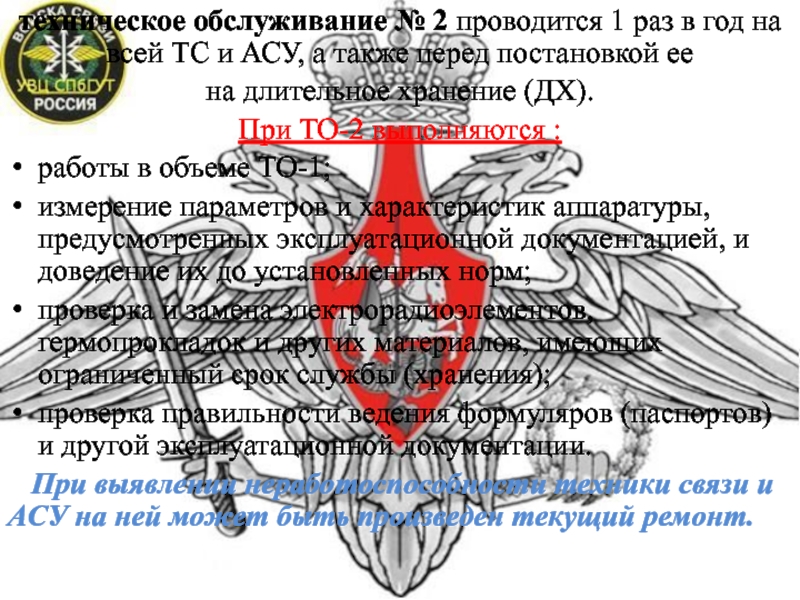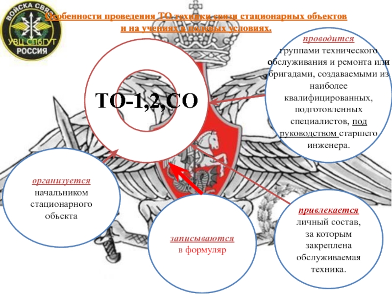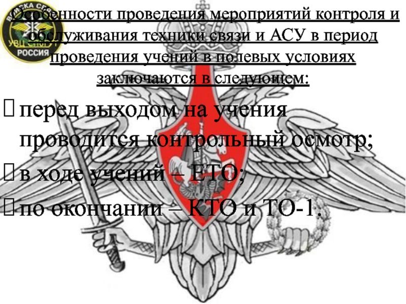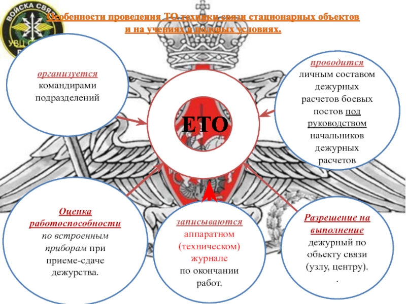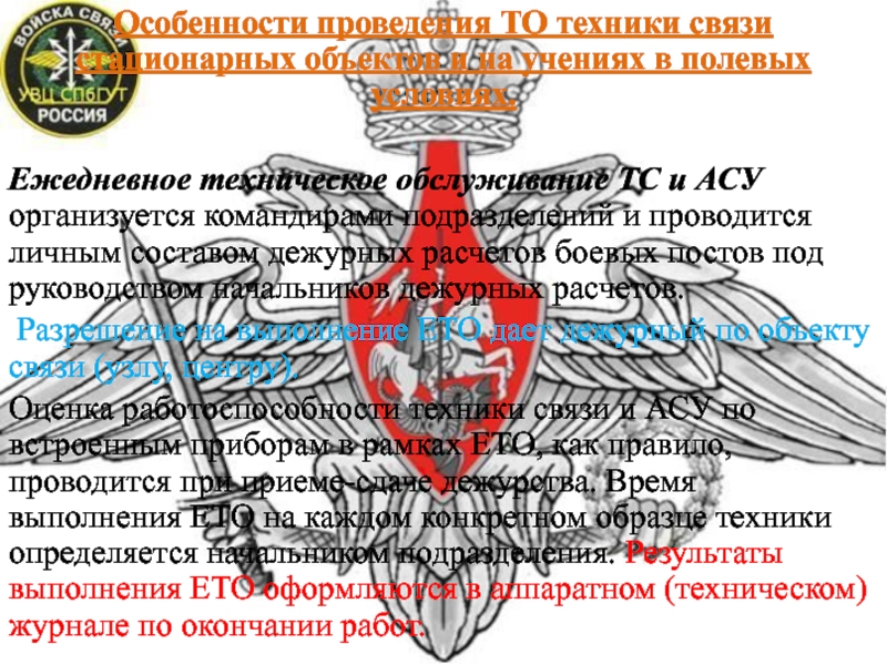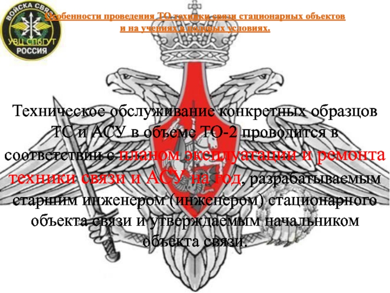Слайд 41Особенности проведения ТО техники связи стационарных объектов и на учениях