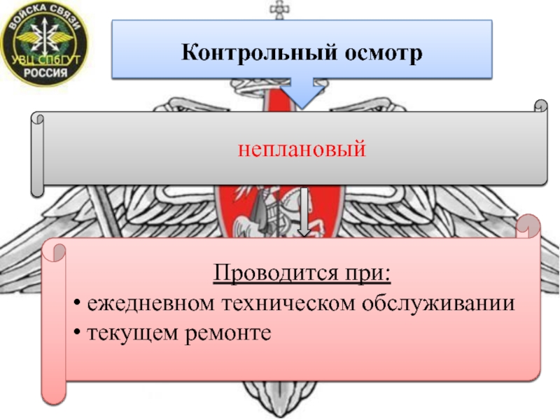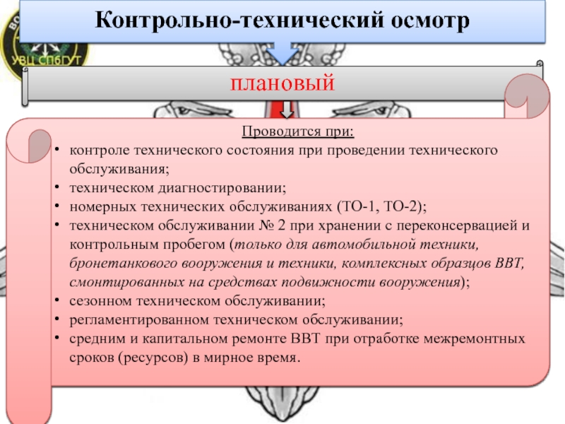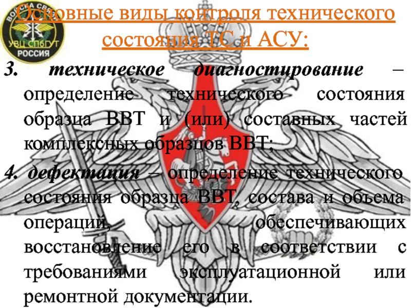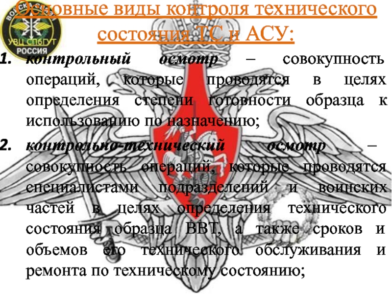 контрольно-технический осмотр – совокупность операций, которые проводятся специалистами подразделений и воинских частей в целях определения технического состояния образца ВВТ, а также сроков и объемов его технического обслуживания и ремонта по техническому состоянию;