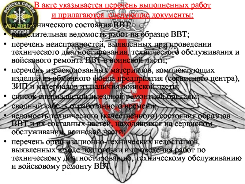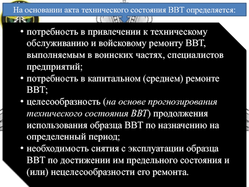 проведении технического диагностирования, технического обслуживания и войскового ремонта ВВТ в воинской части;