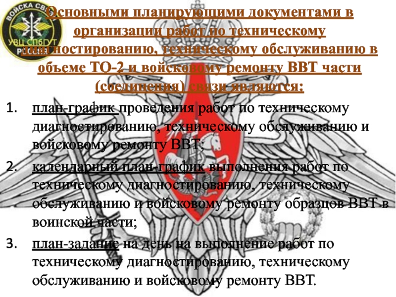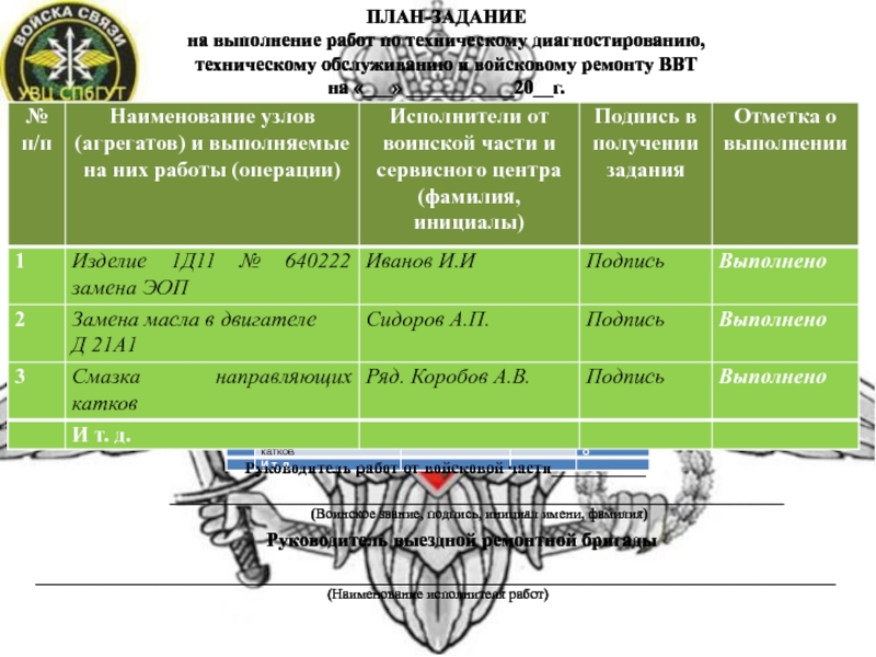 план-задание на день на выполнение работ по техническому диагностированию, техническому обслуживанию и войсковому ремонту ВВТ.
