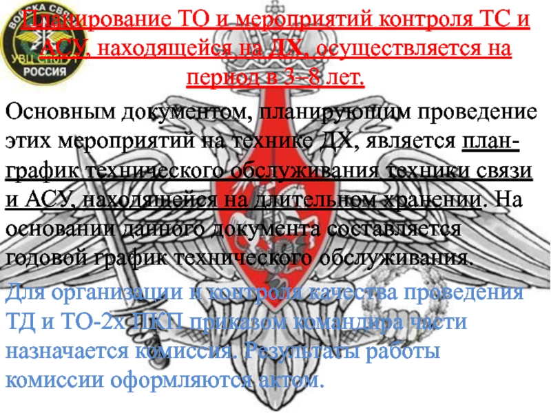 проведение этих мероприятий на технике ДХ, является план-график технического обслуживания техники связи и АСУ, находящейся на длительном хранении. На основании данного документа составляется годовой график технического обслуживания.