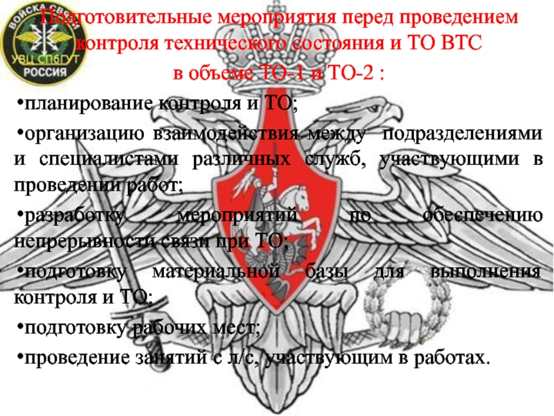 Слайд 36Подготовительные мероприятия перед проведением контроля технического состояния и ТО ВТС