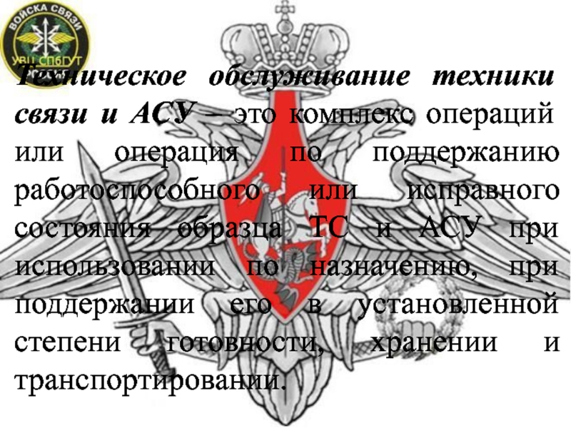 Слайд 12Техническое обслуживание техники связи и АСУ – это комплекс операций