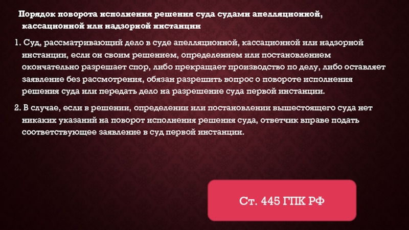 Слайд 43 Порядок поворота исполнения решения суда судами апелляционной, кассационной или