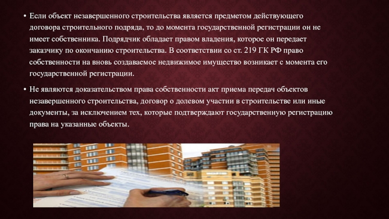 Слайд 37Если объект незавершенного строительства является предметом действующего договора строительного подряда,