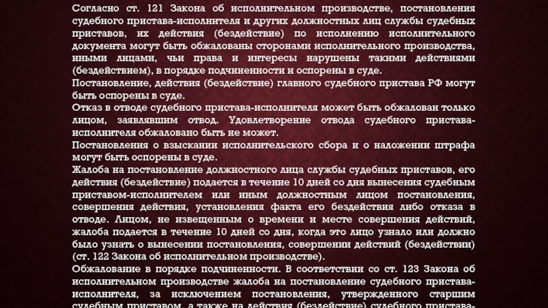 № 118-ФЗ от 21 июля 1997 г. надзор за исполнением законов при осуществлении судебными приставами своих функций осуществляют Генеральный прокурор РФ и подчиненные ему прокуроры.