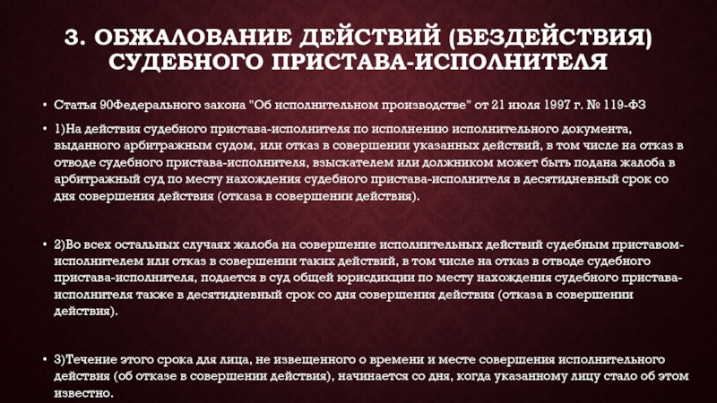 вынесения судебным приставом-исполнителем или иным должностным лицом постановления, совершения действия, установления факта его бездействия либо отказа в отводе. Лицом, не извещенным о времени и месте совершения действий, жалоба подается в течение десяти дней со дня, когда это лицо узнало или должно было узнать о вынесении постановления, совершении действий (бездействии).