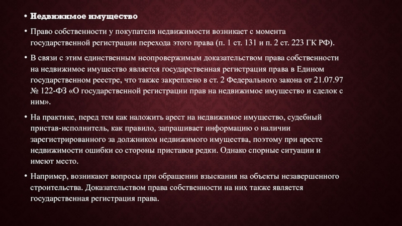Например, возникают вопросы при обращении взыскания на объекты незавершенного строительства. Доказательством права собственности на них также является государственная регистрация права.