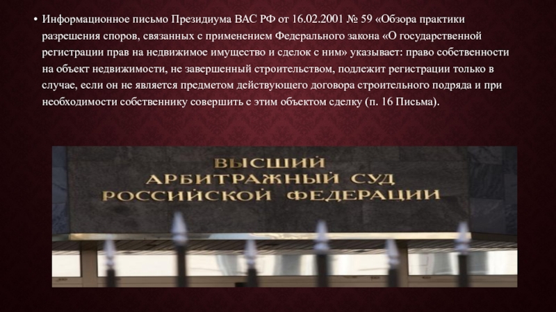 Слайд 36Информационное письмо Президиума ВАС РФ от 16.02.2001 № 59 «Обзора