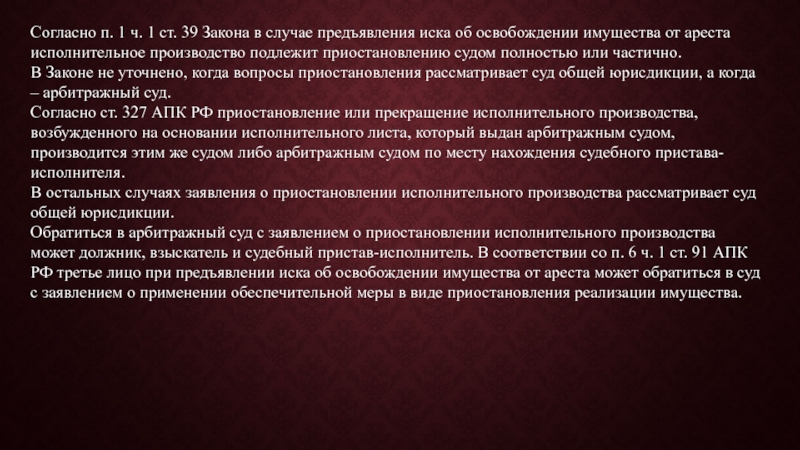 предъявления иска об освобождении имущества от ареста исполнительное производство подлежит