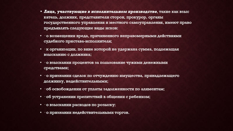 2) лица, участвующие в исполнительном производстве, имеют право предъявлять иски по различным обстоятельствам, возникающим в отношениях по принудительному исполнению.