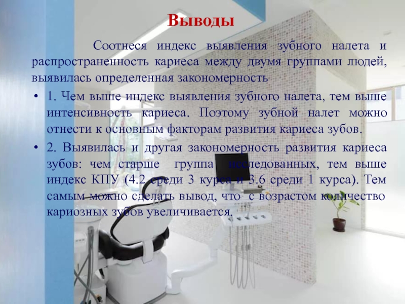 выше индекс выявления зубного налета, тем выше интенсивность кариеса. Поэтому зубной налет можно отнести к основным факторам развития кариеса зубов.