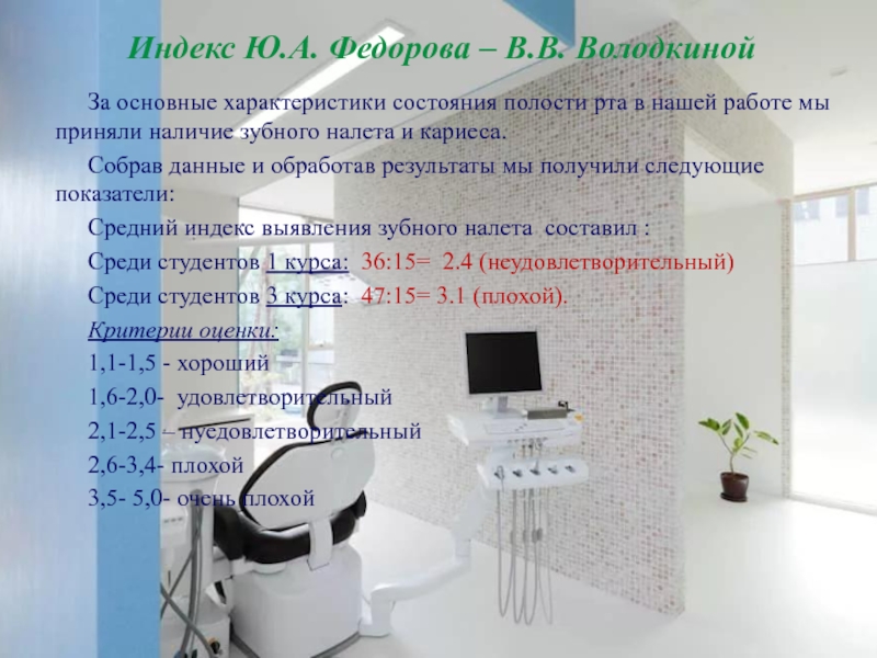 Для регистрации гигиенического состояния полости рта использовался индекс гигиены Федорова-Володкиной.
