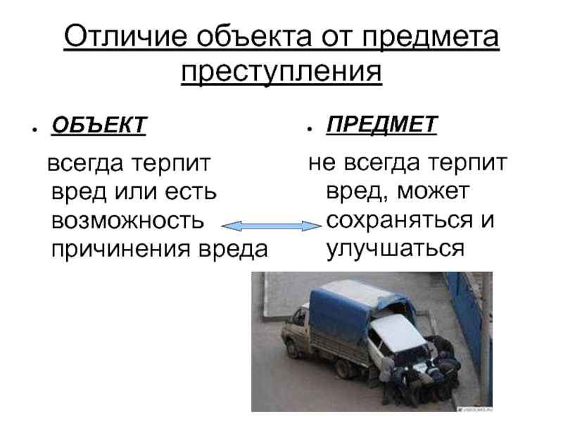 Отличие объекта от предмета преступленияОБЪЕКТ всегда терпит вред или есть возможность причинения вредаПРЕДМЕТне всегда терпит вред, может
