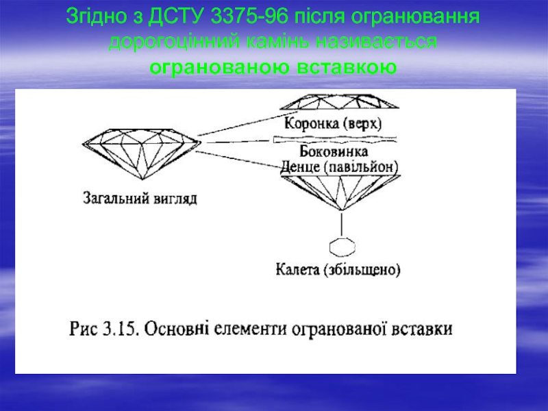 Слайд 13Згідно з ДСТУ 3375-96 після огранювання дорогоцінний камінь називається