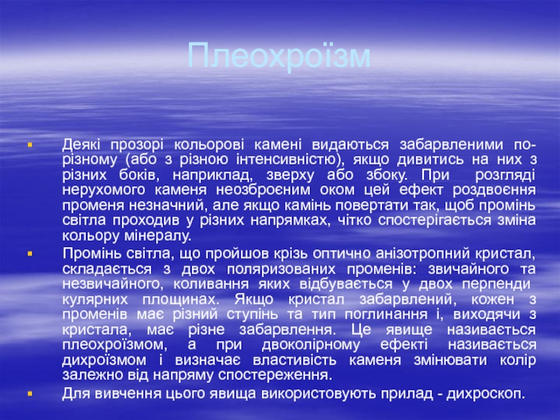 Промінь світла, що пройшов крізь оптично анізотропний кристал, складається з двох поляризованих променів: звичайного та незвичайного, коливання яких відбувається у двох перпендикулярних площинах. Якщо кристал забарвлений, кожен з променів має різний ступінь та тип поглинання і, виходячи з кристала, має різне забарвлення. Це явище називається плеохроїзмом, а при двоколірному ефекті називається дихроїзмом і визначає властивість каменя змінювати колір залежно від напряму спостереження.