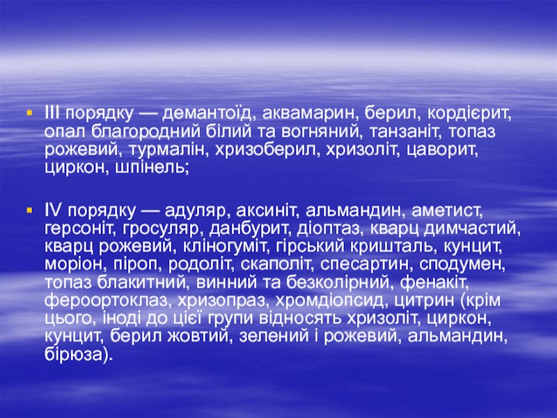 Слайд 65III порядку — демантоїд, аквамарин, берил, кордієрит, опал благородний білий