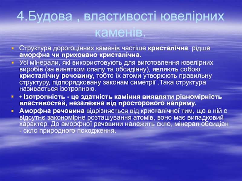 виробів (за винятком опалу та обсидіану), являють собою кристалічну речовину, тобто їх атоми утворюють правильну структуру, підпорядковану законам симетрії .Така структура називається ізотропною.
