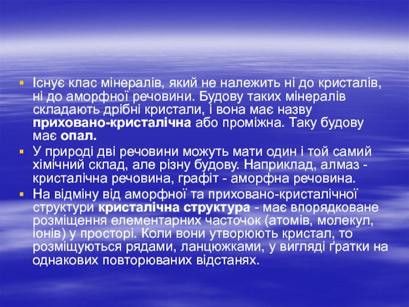 Слайд 69Існує клас мінералів, який не належить ні до кристалів, ні