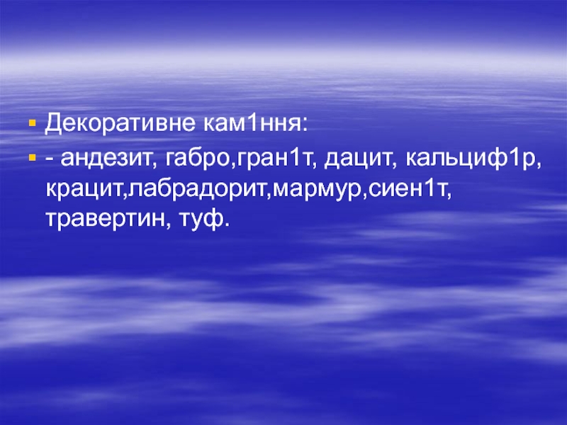- андезит, габро,гран1т, дацит, кальциф1р,крацит,лабрадорит,мармур,сиен1т,травертин, туф.
