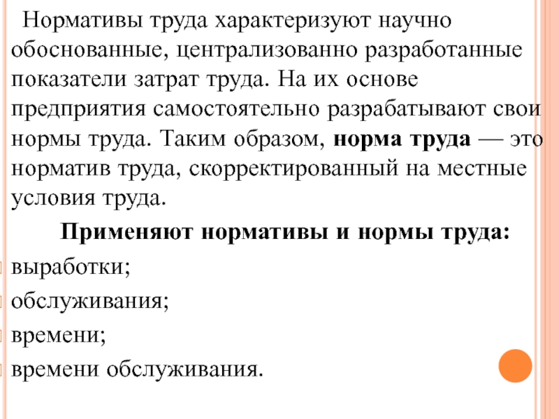 выражена временем, объемом работы, численностью работников и объектов обслуживания. Различают нормативы и нормы труда