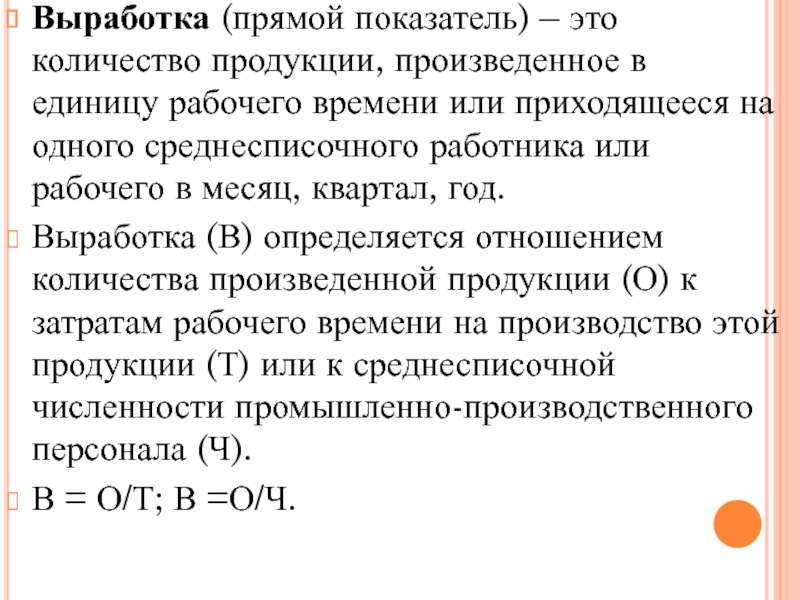 Слайд 51Выработка (прямой показатель) – это количество продукции, произведенное в единицу рабочего