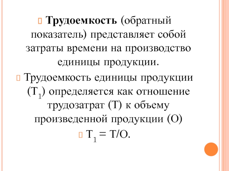 Слайд 52Трудоемкость (обратный показатель) представляет собой затраты времени на производство единицы продукции.