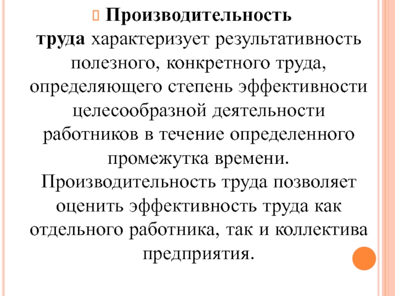 Слайд 49Производительность труда характеризует результативность полезного, конкретного труда, определяющего степень эффективности целесообразной