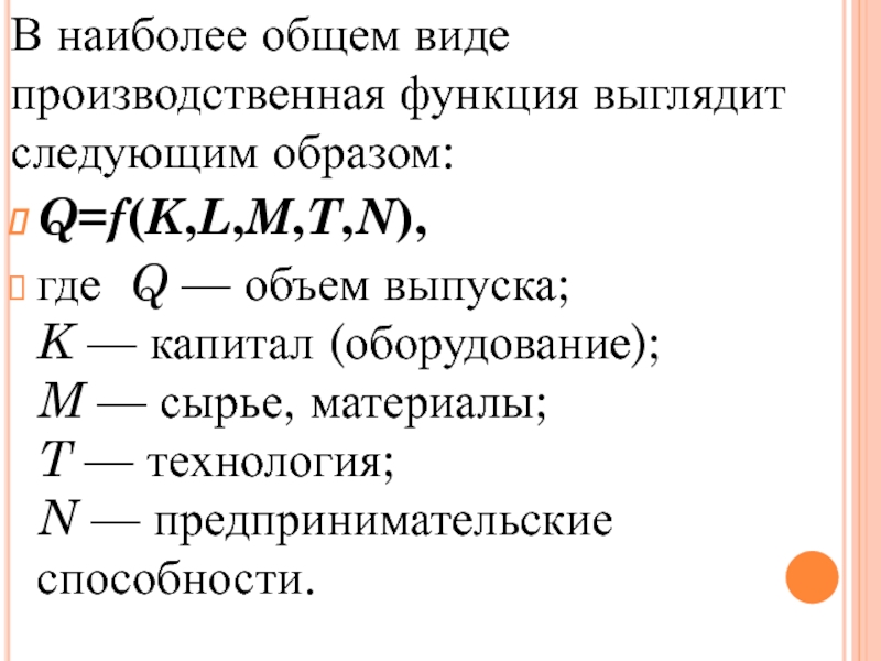 Слайд 40В наиболее общем виде производственная функция выглядит следующим образом: