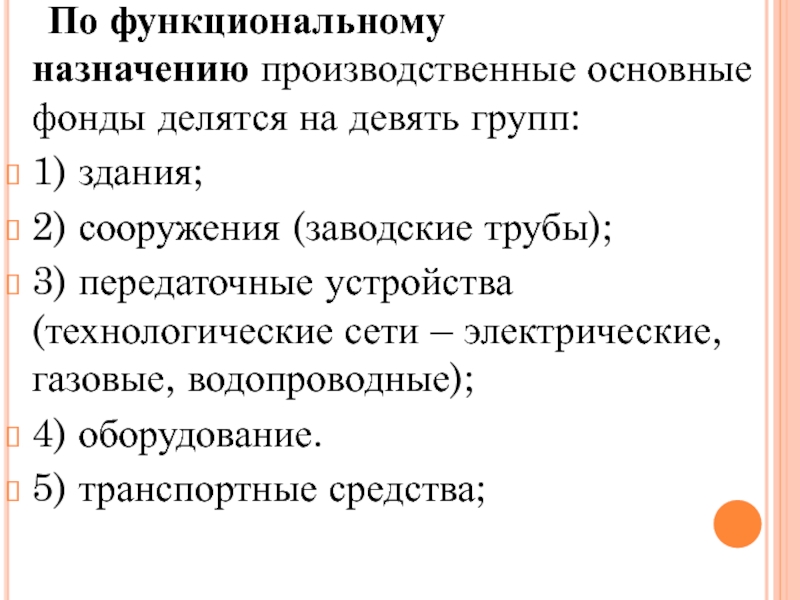 Слайд 31 По функциональному назначению производственные основные фонды делятся на девять групп: