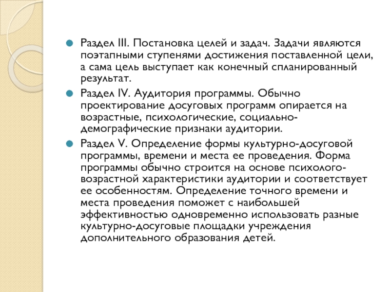 Раздел V. Определение формы культурно-досуговой программы, времени и места ее проведения. Форма программы обычно строится на основе психолого-возрастной характеристики аудитории и соответствует ее особенностям. Определение точного времени и места проведения поможет с наибольшей эффективностью одновременно использовать разные культурно-досуговые площадки учреждения дополнительного образования детей.