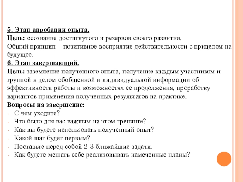 Цель: заземление полученного опыта, получение каждым участником и группой в целом обобщенной и индивидуальной информации об эффективности работы и возможностях ее продолжения, проработку вариантов применения полученных результатов на практике.