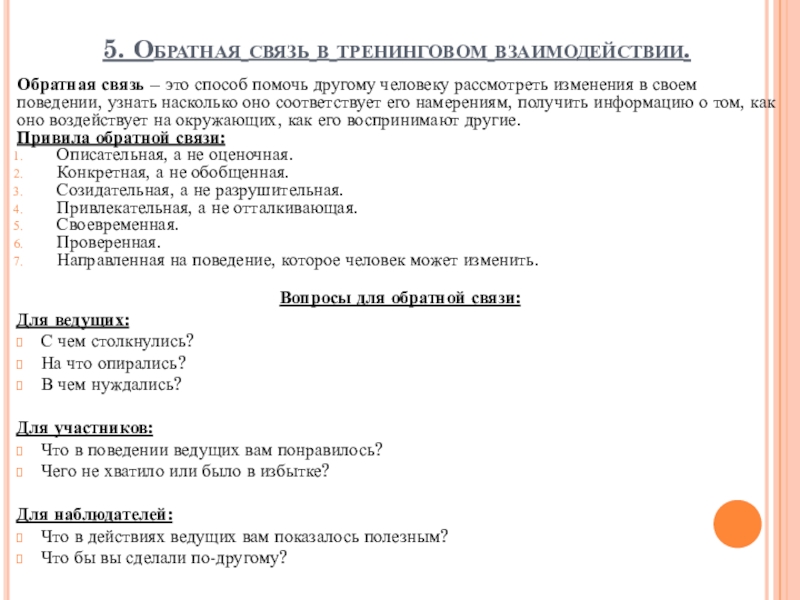 Слайд 105. Обратная связь в тренинговом взаимодействии.