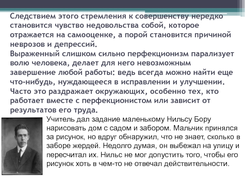 Выраженный слишком сильно перфекционизм парализует волю человека, делает для него невозможным завершение любой работы: ведь всегда можно найти еще что-нибудь, нуждающееся в исправлении и улучшении.