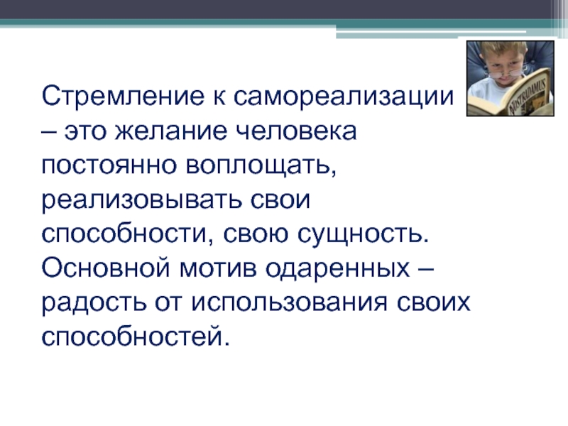 Слайд 4Стремление к самореализации – это желание человека постоянно воплощать, реализовывать