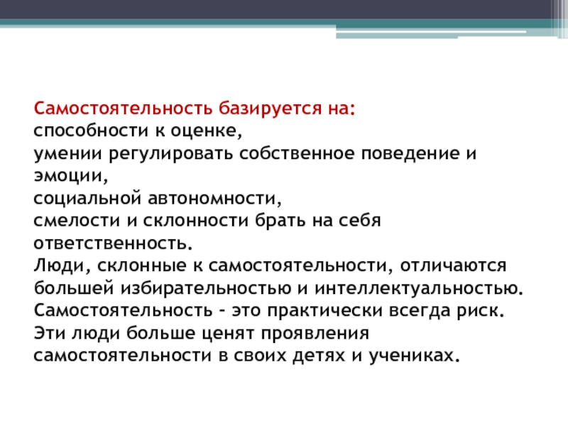 Люди, склонные к самостоятельности, отличаются большей избирательностью и интеллектуальностью. Самостоятельность - это практически всегда риск. Эти люди больше ценят проявления самостоятельности в своих детях и учениках.