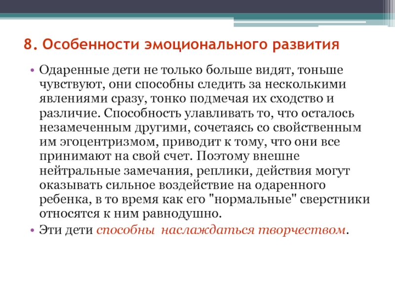 подмечая их сходство и различие. Способность улавливать то, что осталось незамеченным другими, сочетаясь со свойственным им эгоцентризмом, приводит к тому, что они все принимают на свой счет. Поэтому внешне нейтральные замечания, реплики, действия могут оказывать сильное воздействие на одаренного ребенка, в то время как его "нормальные" сверстники относятся к ним равнодушно.