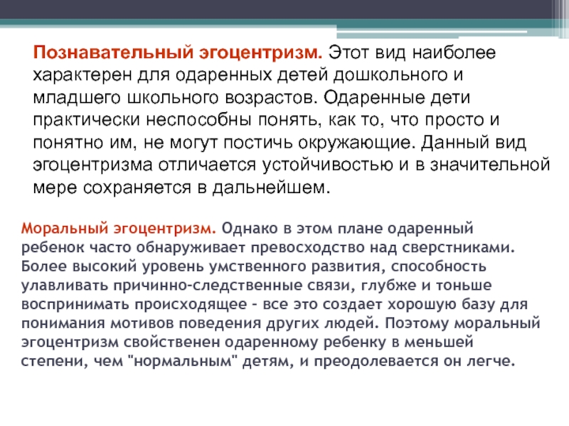 Познавательный эгоцентризм. Этот вид наиболее характерен для одаренных детей дошкольного и младшего школьного возрастов. Одаренные дети практически неспособны понять, как то, что просто и понятно им, не могут постичь окружающие. Данный вид эгоцентризма отличается устойчивостью и в значительной мере сохраняется в дальнейшем.