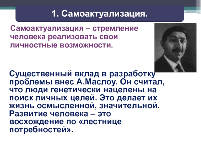считал, что люди генетически нацелены на поиск личных целей. Это делает их жизнь осмысленной, значительной. Развитие человека – это восхождение по «лестнице потребностей».